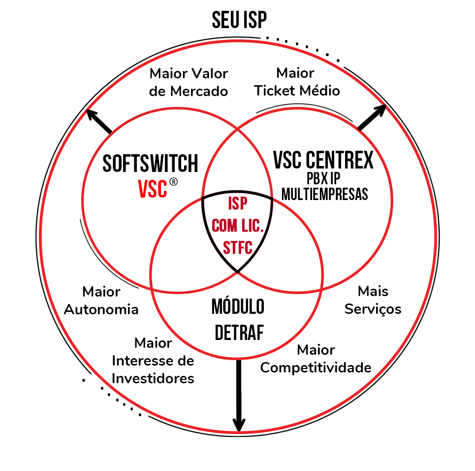O Softswitch VSC é uma completa solução Classe 4 e 5, carrier grade, multitenant, que permite gerenciar integralmente os serviços de um ISP ou Operadora de telecomunicações com Lic. STFC e SCM.